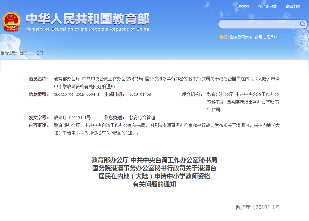 教育部等多部门:港澳台居民在内地可申请中小学教师资格