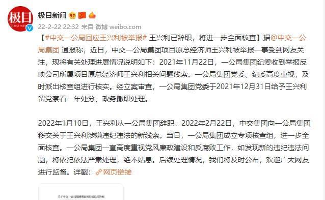 中交一公局回应王兴利被举报:王兴利已辞职,将进一步全面核查