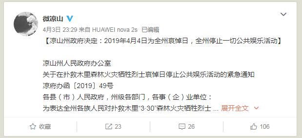 四川凉山州政府:今年4月4日为全州哀悼日 停止一切公共娱乐活动