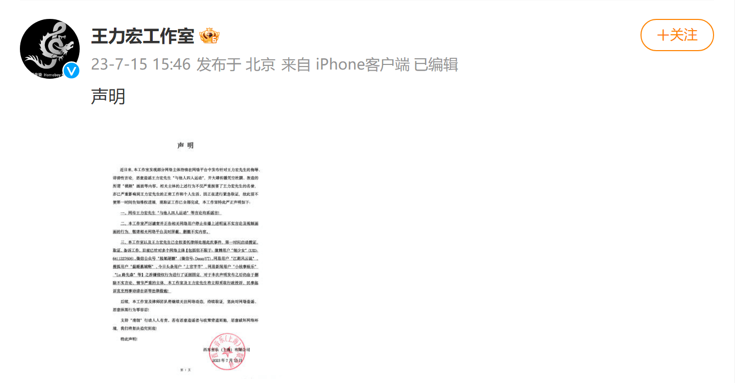 王力宏工作室发声明:网传王力宏“与他人四人运动“等言论系谣言