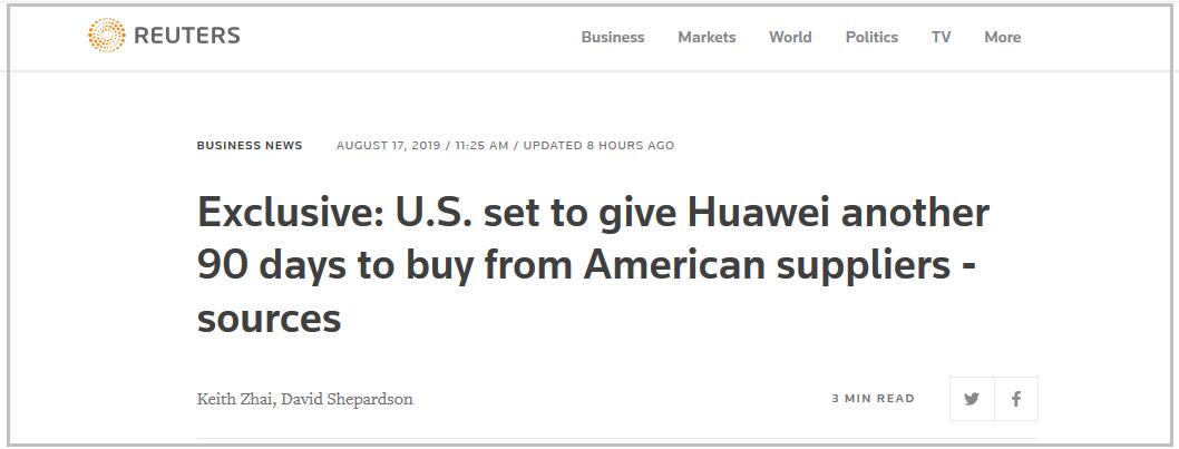 华为临时许可证8月19日到期 美国商务部拟再延长90天