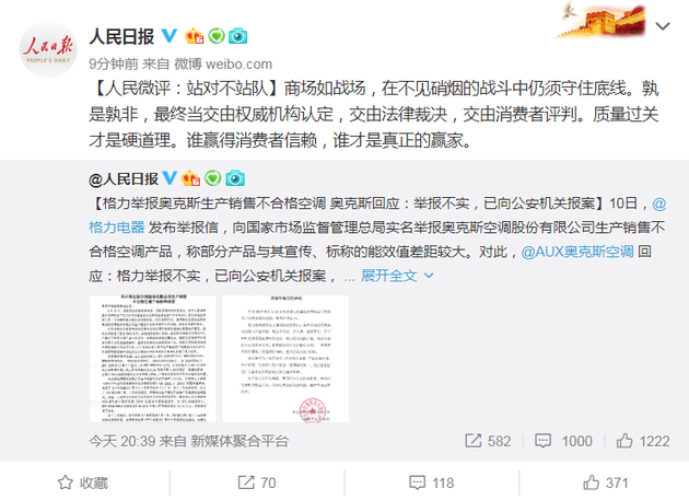 原标题:人民日报评格力举报奥克斯事件:站对不站队