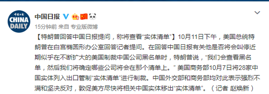 特朗普是否将会叫停美国制裁中国公司黑名单?称将查看“实体清单”