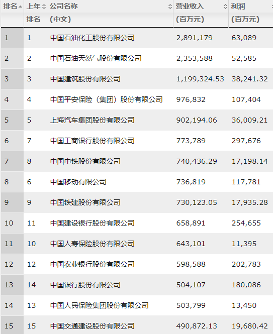 2019年《财富》中国500强今日发布,中石化、中石油稳居前两位,中国建筑位居第三。中国平安蝉联非国有企业第一位。上榜的上市公司总营业收入达到45.5万亿元,较去年增长14.8%,再创新高;净利润达到了3.625万亿元,较去年增长4.21%,相比去年24.24%的涨幅而言,受宏观经济影响大幅放缓。今年上榜公司的年营收门槛为162.38亿元,相比去年提升了17%。
