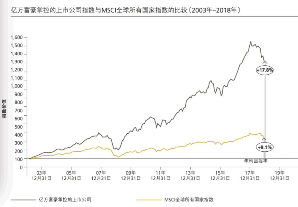 从全球范围来看,截至2018年底的15年中,在股票市场上市的亿万富豪掌控的公司取得17.8%的回报率,远高于MSCI全球所有国家指数的9.1%,几乎是市场年化平均表现的两倍。