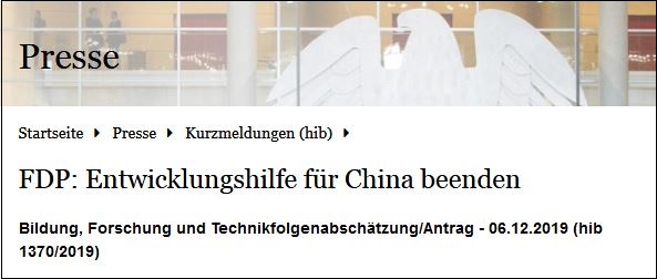 12月6日,自民党又在德国议会提交了一份动议,对中国“发展中国家”的身份进行了无理质疑,称中国是全球商品和金融市场上最重要的参与者,因此要求德国和欧盟“审查”与中国的合作项目,叫停对中国援助贷款。