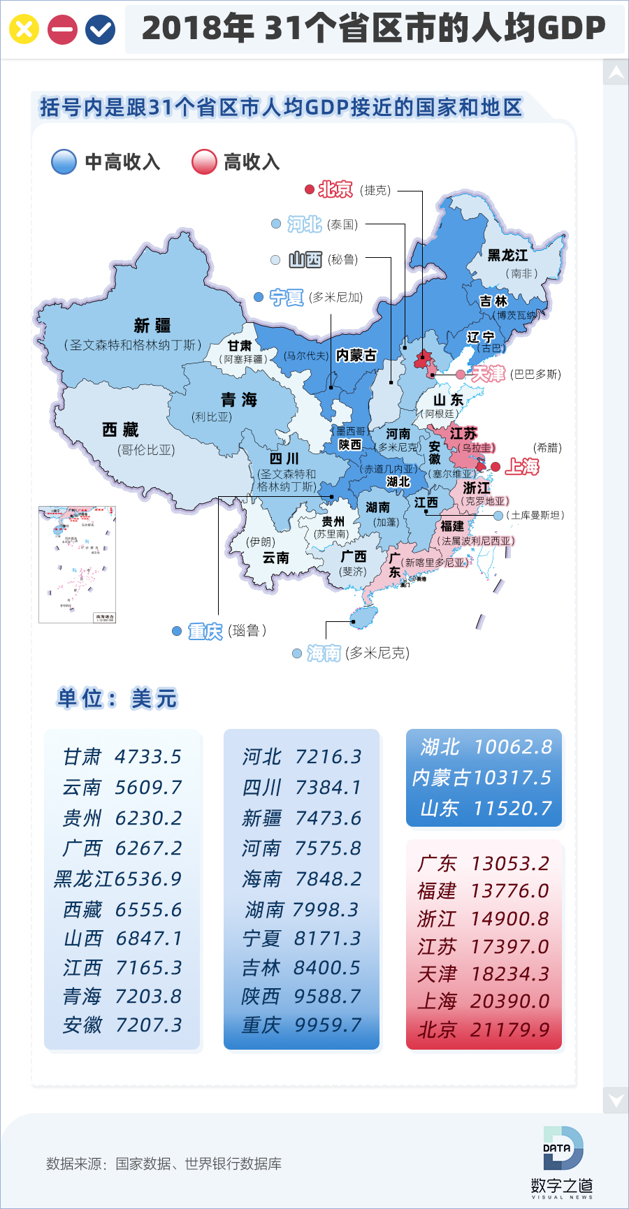 2018年,中国人均GDP9732美元(约合人民币64644元),连人均GDP最低的甘肃也达到阿塞拜疆的人均GDP水平,稳居 “中高收入”行列。京津沪、江苏、浙江、福建、广东更厉害,其人均GDP已步入高收入行列。