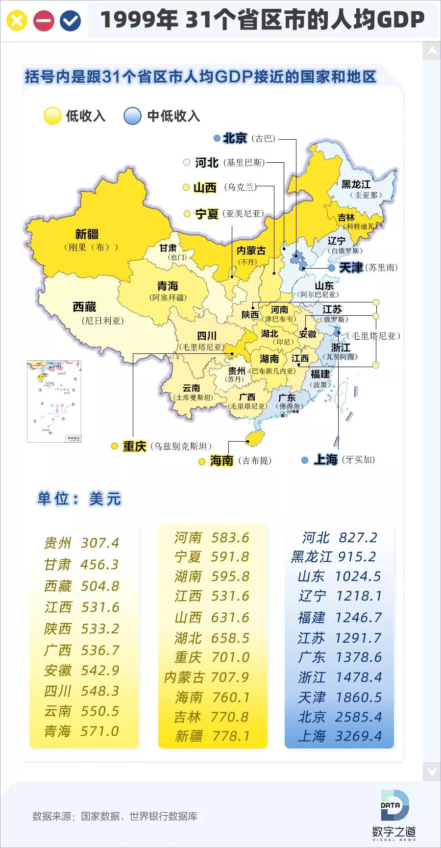 1999年,我们还没成为“世界第二大经济体”,但比起各省GDP和全国总量,我们也“不怵”;只不过说到人均GDP,有一说一,我们确实不占优势。按照世界银行标准,1999年中国31个省区市,20个都属于“低收入”,不少跟非洲穷国的人均GDP差不多,当时上海和北京的人均GDP和牙买加、古巴差不多。