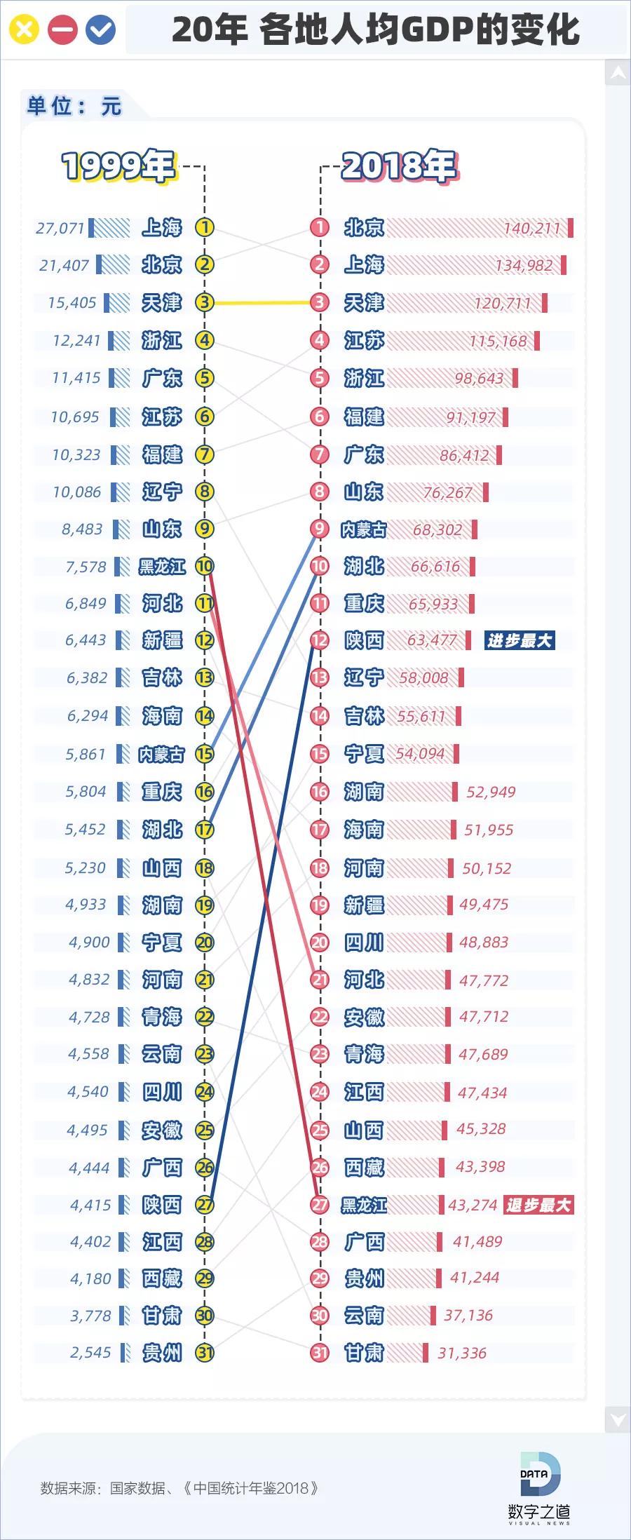 2019年全国GDP的成绩单就快出炉,如果把时间拉长些,回顾21世纪的前20年,在“生活水平”这项硬核KPI面前,全国各地表现怎么样呢?