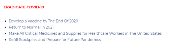 根除新冠这一项中,前两个要点是特朗普一直挂在嘴边的内容:“到2020年底研制出疫苗”、“2021年回归正轨”。后面两个要点则是特朗普政府在应对疫情期间广受诟病的两个问题,因此议程中这样写道:“为美国的医疗工作者提供所有重要的药品和用品”、“补充库存,为未来的大流行做好准备”。