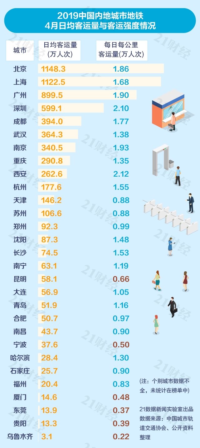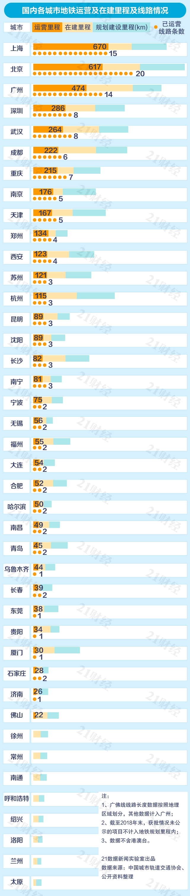 你的家乡修地铁了吗?截至上世纪末,我国只有少数一线城市开通了地铁,进入21世纪,随着中国经济发展基础的稳固,30多个城市先后迈入地铁时代。对民众而言,地铁已不再是新鲜事了。 那么,自新中国成立后的第一条城市地铁开通以来,中国地铁建设事业经历了怎样的发展?哪个城市地铁运营里程最长?地铁运营还存在哪些问题? 33城迈入地铁时代 近10年建设里程翻4倍 近年来,中国大力推广城市轨道交通,地铁大多在地下运行,可以有效减少地面拥堵,因此备受城市规划者青睐。 早于1956年,北京就成立了地铁筹备处。1969年10月1日,北京地铁一期工程赶在新中国成立20周年之时建成通车,北京成为中国第一个拥有地铁的城市。 近几十年来,随着基建投入的增加,中国城市的地铁建设也进入了快车道。据21数据新闻实验室统计,中国国内各城市建设的地铁总里程近4600公里,近10年间翻了4倍。截至目前,国内已有33个城市开通地铁,仅最近10年来,开通地铁的城市就增加了21个,地铁建设进入繁荣阶段。 13城地铁里程超100公里上海第一,北京第二 截至2019年6月6日,在已开通地铁的33座城市当中,有13座城市的地铁运营里程超过100km。其中,上海以669km的运营里程排行第一。其次,北京以617km的里程数位列第二,广州则以473km的里程数位列第三。以运营线路条数而言,北京、上海、广州分别以20条、15条、14条位列前三。 值得注意的是,同为一线城市的深圳,虽然以285km的运营里程上排行第四,但里程数与北上广的差距较大,而且武汉、成都、重庆等二线城市后来居上,运营里程数与深圳的差距在逐渐减少。 就地铁规划的总里程而言,第一梯队的北京、上海、广州均超过1000km,第二梯队的深圳、武汉、成都则紧随其后,规划总里程超过800km。 城轨运营普遍亏损6城地铁客运强度不达标 2018年,30多座城市共花了超过6000亿元修建包括地铁在内的城市轨道交通,但只有少数城市的城轨运营实现收支平衡。 据对28个城市的不完全统计显示,2018年,全国城市轨道交通平均单位车公里运营本23.8元,运营收入17.2元;平均单位人公里运营成本0.84元,运营收入0.48元。2018年仅杭州、青岛、深圳、北京等4座城市实现收支平衡,其余24座城市都在亏本运营。2018年运营收支比仅为78%,但比2017年收窄8个百分点。 从整体上看,城市轨道运营入不敷出仍然是普遍情况,而地铁作为城市轨道交通的主力也难以幸免。数据显示,不少城市的地铁客运强度仍达不到最低标准。 从日均客运量上来看,北京是全国地铁人流量最大的城市,2019年4月北京、上海地铁客流量平均每天超过1000万人次,有12座城市地铁平均每天客流量超过100万。 但早在2015 年,国家发改委发布文件要求,拟建地铁初期负荷强度不低于每日每公里0.7万人次。而根据2019年4月对29个城市的不完全统计,昆明、宁波、厦门、东莞、贵阳、乌鲁木齐等6个城市地铁客运强度都在每日每公里0.7万人次以下,并不达标。 出品:21数据新闻实验室 |