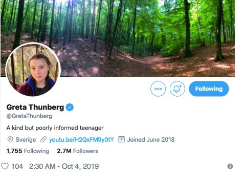 普京的话很快传到了通贝里耳中,她10月3日修改了自己的推特签名:一个善良但孤陋寡闻的少年(A kind but poorly informed teenager)。