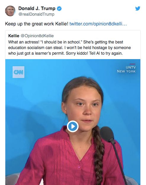 特朗普随后在推特放上一段通贝里严厉致辞的视频,并配文说“她看起来像一个非常快乐的年轻女孩,期待着光明和美好的未来。看到这个,真好!”