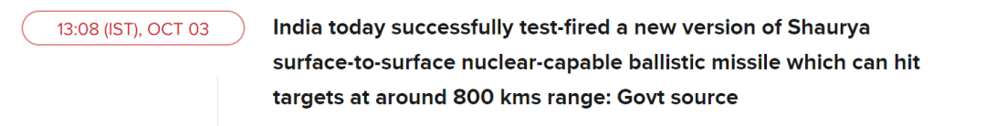 《印度时报》援引消息人士称,这种新型导弹可击中大约800公里距离的目标,目前已成功进行了试验,将作为现有同类导弹的一个补充,列装战略部队。