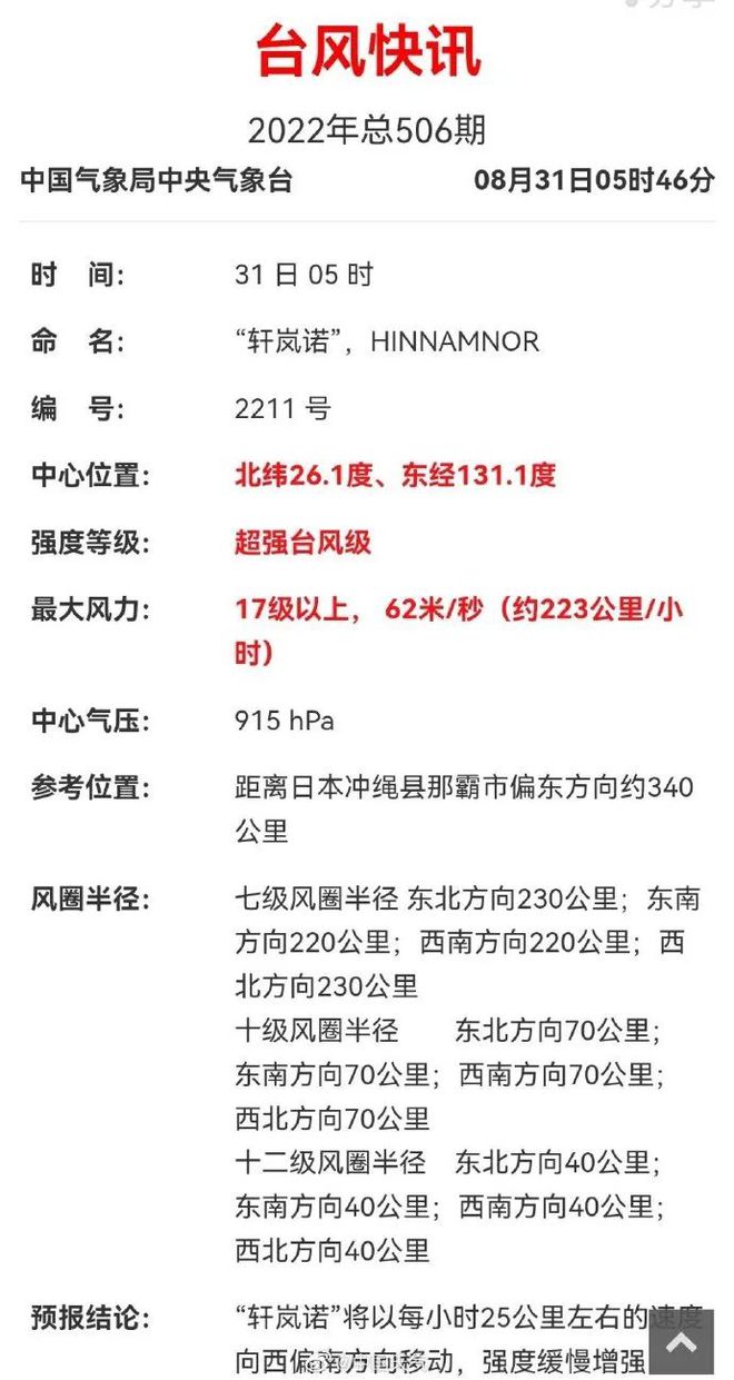 温州人注意! 超强台风“轩岚诺” 正在逼近! 今年首个超强台风“轩岚诺”来势汹汹 超强台风“轩岚诺”,未来4~5天都将维持超强台风级,9月3日夜间进入东海海面。 预计,“轩岚诺”将以每小时30公里左右的速度向西偏南转西南方向移动,9月1~2日将在琉球群岛以东洋面停滞或回旋,而后转向北偏西方向移动,3日夜间移入东海东南部海面。未来4~5天“轩岚诺”将维持超强台风级的强度,最大强度可达17级以上(62~70米/秒)。 受南下弱冷空气和“轩岚诺”外围环流的共同影响,9月1日凌晨开始我国东海海域的风力将逐渐加大到6-8级,阵风9-10级。 气象专家分析,由于台风生成时纬度较高,又遇上副热带高压挤压以及“东北冷涡”南下,叠加影响下,后续走势路径比较复杂。 温州多地疏散游客 8月30日中午,我市召开11号台风“轩岚诺”防御工作会商会并部署防台工作。目前台风“轩岚诺”已加强为超强台风,会议要求各级各部门要清醒认识“轩岚诺”的危害性,按照台风正面影响我市的定位,做好万全准备,确保防台工作万无一失。 昨天,温州平阳县南麂海域已出现8级大风,预计风力将持续加大。南麂岛已疏散了岛上所有游客,并于今天起停航南麂航班,所有户外景区也将关闭。 受台风“轩岚诺”影响,温州瑞安沿海9月1日起风力将逐渐增强到8-9级阵风10级。目前正值旅游旺季,海岛旅客众多,为避免大量游客滞留海岛,温州飞云江海事处联合地方政府迅速启动应急预案,组织开展北麂、北龙两座海岛旅客疏散工作,并在飞云江口等通航密集区域通过甚高频及时提醒过往船舶注意避让。同时,执法人员通过海上智控平台等信息化手段对“北龙海马”“瑞安北麂”两艘客船航经水域进行实时护航,随时提醒附近水域情况。 还有一个台风要生成? 根据中央气象台中期预报,“轩岚诺”将于31日夜间开始影响我国东部海域。另外,未来10天,西北太平洋还将可能有1个台风生成。按照命名表,下一个台风就是“梅花”。 高温彻底消退!冷空气来袭 受降雨和冷空气影响,今天全省高温将会“偃旗息鼓”,气温下降明显,预计今天除温、台、丽外,其他地区最高气温将跌至30℃以下,清凉明显。 自9月1日起浙江高温天气彻底缓解,我省不仅难觅35℃高温踪影,而且气温基本保持在30℃之下,暑气消散,舒爽感渐生。 温馨提醒: 本周浙江阵雨或雷雨天气较多,尤其30日后期至31日范围较大,短时暴雨和雷雨大风等强对流天气发生风险高,需注意防范短时暴雨可能引发的小流域山洪、山体滑坡等次生灾害,同时要注意防范雷雨大风和强雷电灾害。 |