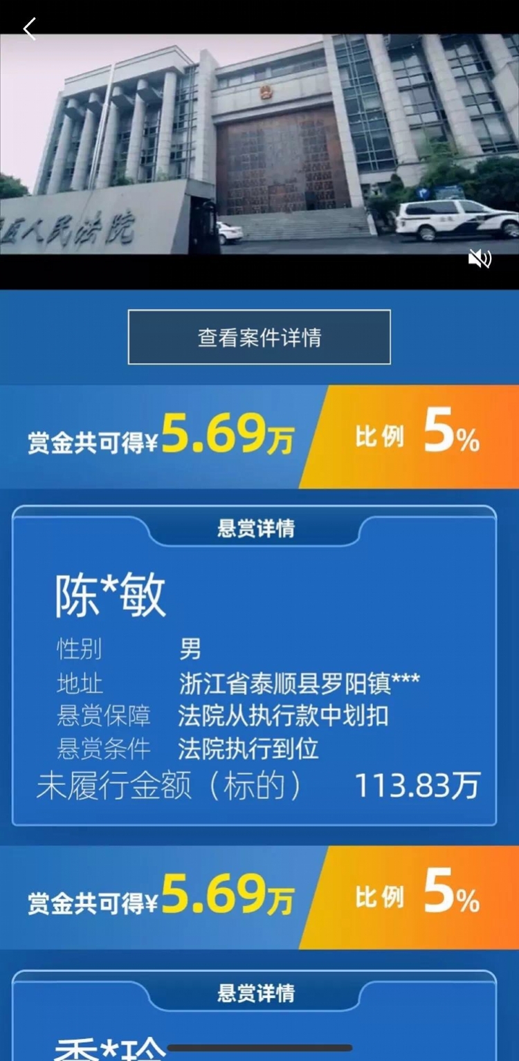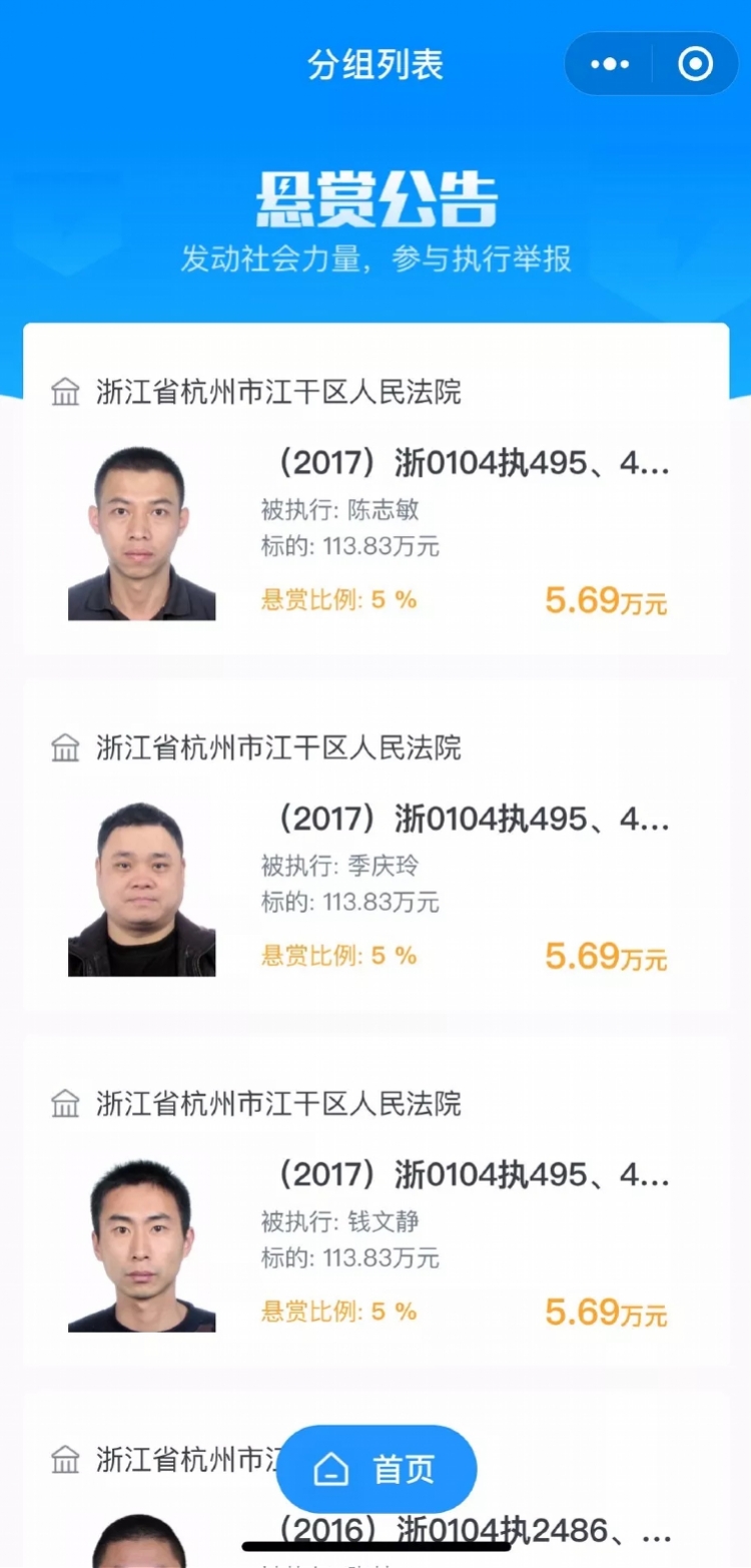 9月16日,江干区政府新闻办公室发布消息称,杭州江干法院系运用微信小程序在微信朋友圈投放悬赏令。该悬赏令在法院官网、公众号以及特定朋友圈同时同步发放。 9月17日,南都记者查询“江干法院悬赏执行”小程序发现,被执行人未履行标的最高为17735.17万,按照5%的悬赏比例,单笔悬赏金额可达886.76万。 来源:南方都市报 |