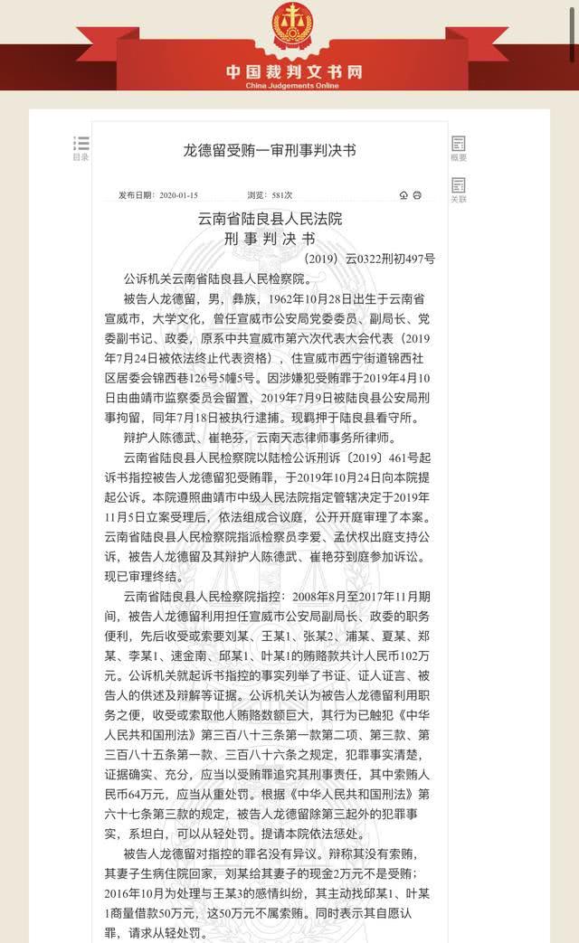 经法院审理查明,2008年至2017年期间,龙德留利用担任宣威市公安局副局长、政委的职务便利,先后收受或索要刘某等人贿赂款共计人民币102万元,在工程承揽建设及工程款拨付、违法案件处理、职务晋升调整等过程中,为他人谋取利益,以龙德留犯受贿罪,判处有期徒刑四年零六个月,并处罚金人民币四十万元。