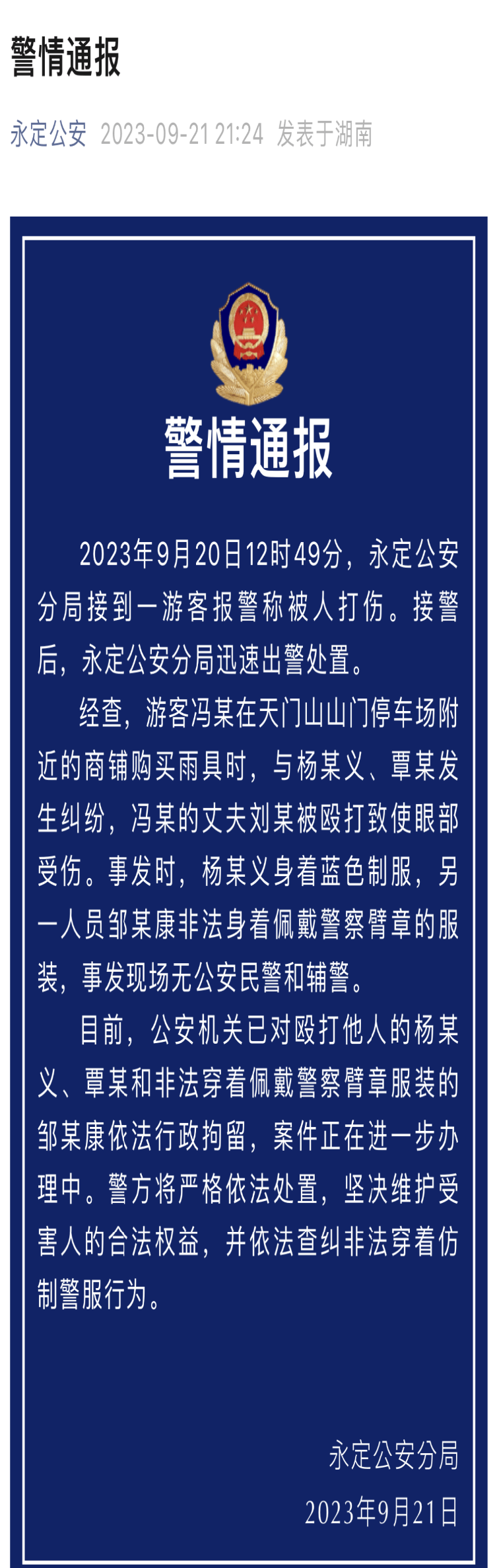 9月20日中午,有网友发布信息称,其在湖南张家界天门山景区停车场与商户在购买雨具时发生争执,随后更是被商户及穿制服人员殴打。 视频截图。 21日晚9点24分,永定公安发布警情通报:2023年9月20日12时49分,永定公安分局接到一游客报警称被人打伤。接警后,永定公安分局迅速出警处置。 视频截图。 经查,游客冯某在天门山山门停车场附近的商铺购买雨具时,与杨某义、覃某发生纠纷,冯某的丈夫刘某被殴打致使眼部受伤。事发时,杨某义身着蓝色制服,另一人员邬某康非法身着佩戴警察臂章的服装,事发现场无公安民警和辅警。 目前,公安机关已对殴打他人的杨某义、覃某和非法穿着佩戴警察臂章服装的邹某康依法行政拘留,案件正在进一步办理中。警方将严格依法处置,坚决维护受害人的合法权益,并依法查纠非法穿着仿制警服行为。 来源:大皖新闻 |