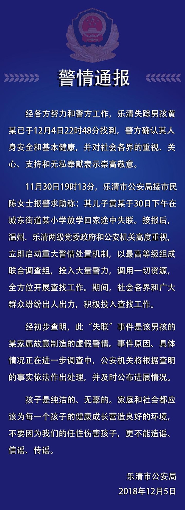 【此前消息】 记者梳理采访疑点 随着黄政豪安全回到家中,乐清男孩走失事件终于有了结果。浙江新闻客户端记者接连多日跟踪报道,记者梳理了12月4日采访过程中碰到的几个疑点。 疑点一 妈妈一天接受两次笔录 12月4日中午11时许,记者赶往乐清市公安局虹桥派出所时,只见到黄政豪的父亲黄良义,当时,他已经四天没合眼。目光搜寻了一番,没见到孩子母亲。黄良义解释道,妻子在派出所里面做笔录。虽然心有疑惑,但为了尽快寻找孩子走失线索,记者没有太多顾虑。 12月4日下午3时许,记者来到黄良义位于乐清市虹桥镇振兴小区的出租房,只见楼下停了一辆警车。走进黄良义家里,他的妹妹示意记者安静,并悄悄说:“警察在给孩子妈妈做笔录。” “又做笔录?”记者的心里不禁咯噔了一下。但是一想起黄良义在派出所说的一句“自从孩子走失后,老婆已经晕厥多次”,便没有继续深想了。 疑点二 孩子为什么要在虹桥中学下三轮车 在12月4日的采访中,黄政豪的姑姑一直重复一个问题:“我们家住振兴小区,为什么孩子坐三轮车的时候要从虹桥中学下车?” 黄政豪姑姑说,虽然虹桥中学和振兴小区的距离不远,但路线完全不同。 12月5日上午,一名参与救援的志愿者说:“如果有人‘教唆’,那就可以理解了。” 今日凌晨传来消息:温州全市接力寻找的乐清男孩找到了 悬了5天的心,终于放下 12月5日凌晨,乐清公安机关向记者证实,失联5天的温州乐清11岁男孩黄政豪已经找到,平安无事。经初步查明,此“失联”事件是该男孩的某家属故意制造的虚假警情。事件原因、具体情况正在进一步调查中,公安机关将根据查明的事实依法作出处理,并及时公布进展情况。 连日来,温州全市爱心接力,搜寻队伍不断扩大,所有的一切,只为找到黄政豪。 12月4日中午,记者在乐清市公安局虹桥派出所见到了黄政豪的父亲黄良义。黄良义头发凌乱、面容憔悴,已经4天没合过眼。 黄良义是乐清市城东街道云岭村人,近几年为了经商方便,一家人租住在乐清市虹桥镇,儿子黄政豪就读于虹桥镇城东一小五年级。 11月30日17时20分放学后,黄政豪没有像往常一样回家。“从学校到家有八九公里路程,小时候他每天上学都是家人开车接送,现在孩子大了,我们忙的时候他就乘坐公交车到虹桥车站,然后再坐三轮车或者走路回家。”黄良义说。 当天晚上,黄良义的妻子发现孩子一直没回家,便去公交车站等,可等了一个小时也没见孩子的踪影。 11月30日19时13分,黄良义夫妇商量之后,向乐清警方报警求助,警方连夜开始寻找。警方发现,11月30日17时28分,背着书包的黄政豪从城东街道坐公交车到虹桥,17时49分在虹桥客运西站公交站台下车,随后步行至西站边逗留了5分钟左右。17时55分,黄政豪在西站乘坐载客三轮车,17时58分,在虹桥镇沙河路下车,之后独自一人步行时失联。黄政豪下车的地方,离家只隔着一条街。 黄政豪失联的这些天,温州全市都在接力找人,志愿者、救援队一同出动,越来越多的市民加入寻人行列。 乐清公益寻人的负责人郑佰洪介绍,他们在11月30日21时左右接到黄政豪家人的求助电话,随后一边通过微信平台转发寻人消息,一边集结志愿者在村里、公园甚至河边进行搜寻。 乐清龙之野救援队也早早介入,“孩子家附近所有的出租房我们都走了一遍,所有空着的房子都找遍了。”救援队队长刘晓光告诉记者。 12月2日22时,在黄政豪最后出现地点附近的沙河边,多支救援队轮番寻找。“这几天,蛙人、网、排钩、汽船都用上了,进行地毯式搜寻,但是都没有找到人。”乐清蓝天救援队队长陈庆伟说。 12月4日,浙报集团“浙里”系列微信公众号同步刊发黄政豪走失消息后,受到广大网友关注,爱心网友纷纷将寻人的微信内容转发至朋友圈。如今人已找到,大家悬了5天的心,终于放下了。 |