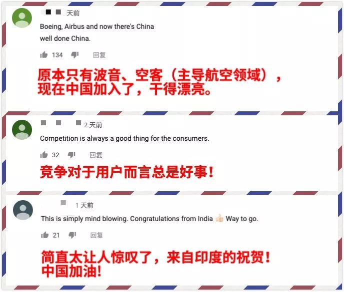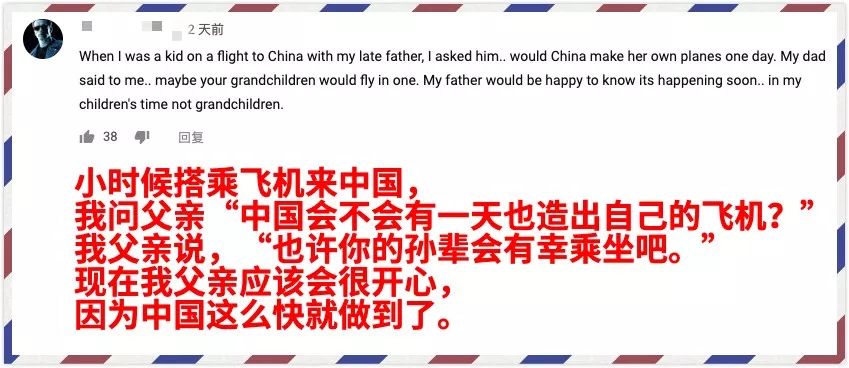 还有外国网友回忆起儿时的经历:“小时候搭乘飞机来中国,我问父亲‘中国会不会有一天也造出自己的飞机?’我父亲说,‘也许你的孙辈会有幸乘坐吧’。现在我父亲应该会很开心,因为中国这么快就做到了。”