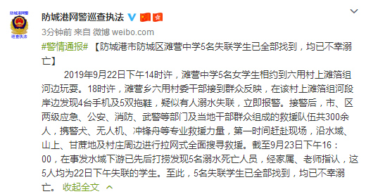 2019年9月22日下午14时许,滩营中学5名女学生相约到六用村上滩箔组河边玩耍。18时许,滩营乡六用村委干部接到群众反映,在该村上滩箔组河段岸边发现4台手机及5双拖鞋,疑似有人溺水失联,立即报警。接警后,市、区两级应急、公安、消防、武警等部门及当地干部群众组成的救援队伍共300余人,携警犬、无人机、冲锋舟等专业救援力量,第一时间赶赴现场,沿水域、山上、甘蔗地及村庄周边进行拉网式全面搜寻救援。截至9月23日下午16:00,在事发水域下游已先后打捞发现5名溺水死亡人员,经家属、老师指认,这5人均为22日下午失联的学生。至此,5名失联学生已全部找到,均已不幸溺亡。 |