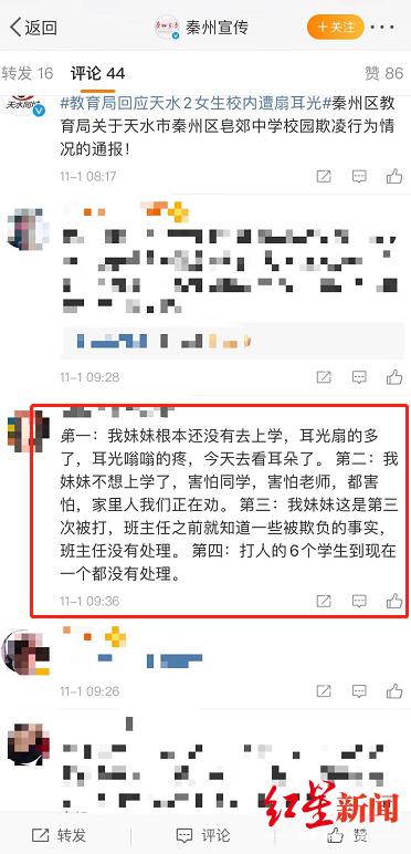 “他们打完后会威胁、警告,说告诉家长就在学校打死妹妹她们。”田某姐姐表示,如果这次被打视频没有传至网络,妹妹可能还将继续在学校被其折磨。 来源:新闻晨报 |