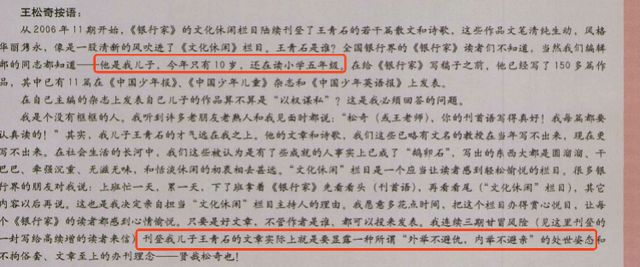 此前,南都记者检索发现,王松奇也曾自问刊发儿子文章的行为是否算“以权谋私”,并进行解释。他在2007年《银行家》第一期中发表文章《王松奇按语》中写道,“王青石是谁?全国银行界的《银行家》读者们不知道,当然我们编辑部的同志都知道——他是我的儿子,今年只有10岁,还在读小学五年级。在给《银行家》写稿子之前,他已经写了150多篇作品,其中已有11篇在《中国少年报》、《中国少年儿童》杂志和《中国少年英语报》上发表。”