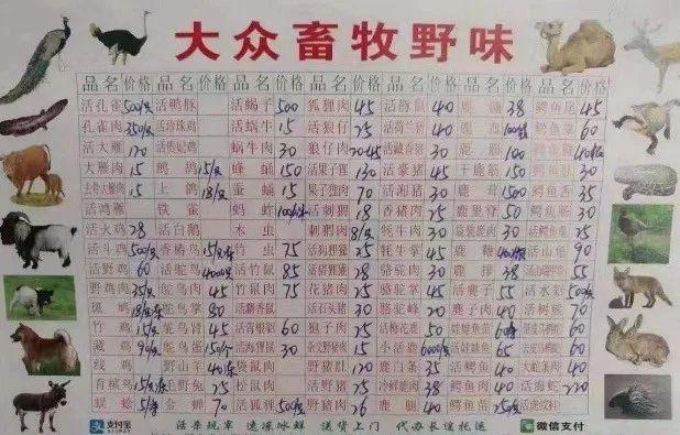 日前,网上流传出一张武汉华南海鲜市场里名为“大众畜牧野味”店的菜单,显示有活狗狸獾、活猪狸獾、活竹鼠、竹鼠肉、活果子狸、果子狸肉等野生动物。