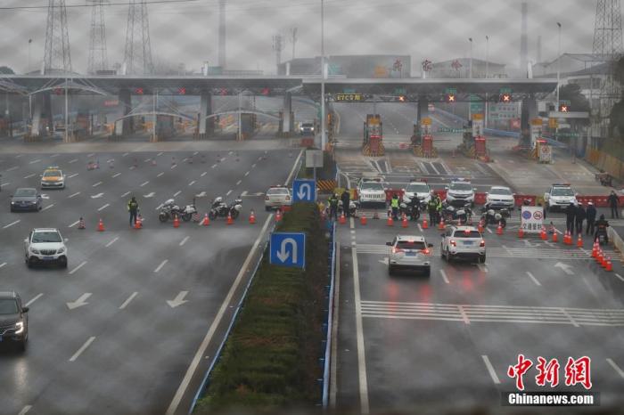 1月23日,警方在武汉市洪山区武鄂高速公路(龚家岭收费站)进行交通管制。中新社记者 张畅 摄