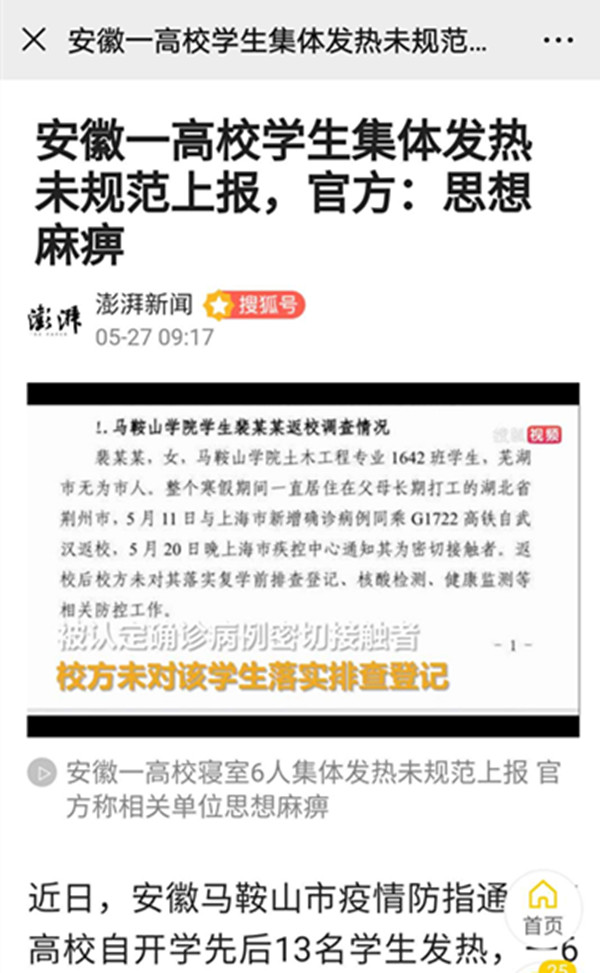 近日,安徽马鞍山市疫情防指通报某高校自开学先后13名学生发热,一6人寝集体发热。另一高校一人被确认为密接者,未落实登记核检等政策。政府责令整改,追究相关人责任。 来源:新京报 |