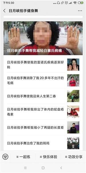 “脑出血后跳拍手舞,啥药不吃了”“恶性肿瘤后跳日月峡拍手舞迅速恢复健康”“日月峡拍手舞治愈了我的耳鸣”等文章标题夺人眼球,宣称拍手舞具有治愈功能,重症期间不吃药、放弃化疗通过拍手舞即可康复。