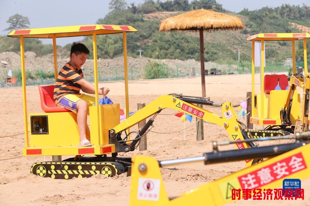 10月2日,小朋友在浙江省湖州市德清县乾元镇城北村矿坑沙滩游玩。