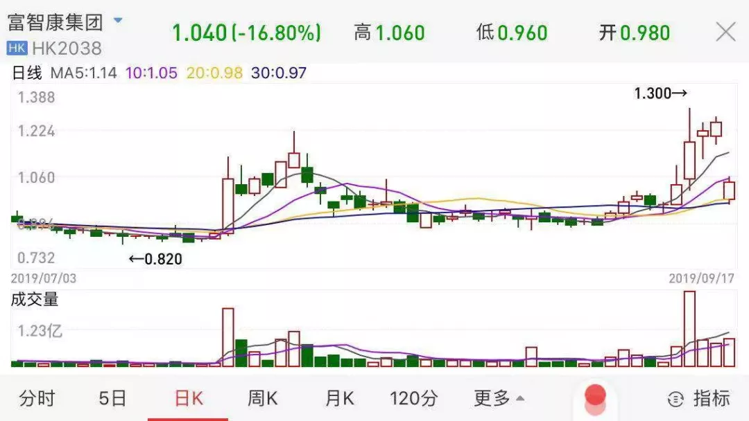 5天之前,郭台铭退出国民党时,鸿海旗下港股上市公司富智康集团(2038.HK)曾大涨14.56%,其后两个交易日也连续收涨。而在郭台铭决定“弃选”后,今天富智康集团股价跳空低开,一度跌超23%,截至发稿,跌幅为18.40%,每股报1.02港元,市值蒸发18.9亿港元,目前总市值为83亿港元。