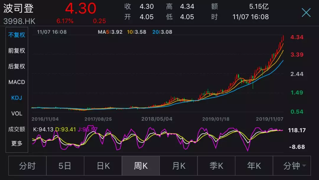 值得一提的是,截至2019年11月7日13:35,波司登股价为4.33港元,而2018年1月2日开盘,波司登每股报价仅为0.62港元,也就是说,两年内,波司登股价上涨了将近6倍,总市值增加了401.422亿港元。