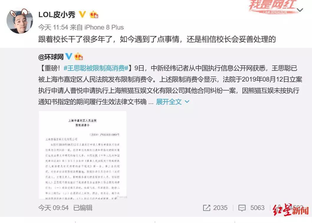 不久前,王思聪担任董事长的北京普思投资有限公司(下称普思资本)的股权被上海宝山区人民法院冻结,具体冻结数额不详,冻结日期自2019年10月15日起至2022年10月14日。