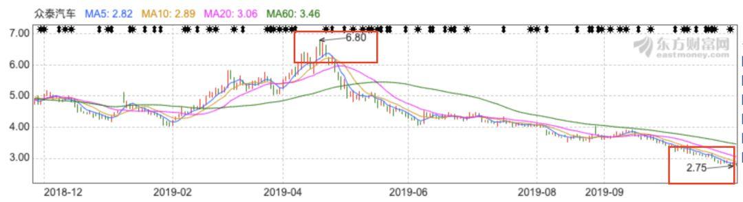 从今年4月开始,众泰汽车股价已经从最高6.8元/股一路下跌至2.75元/股,股价跌幅近60%,市值蒸发超80亿元。