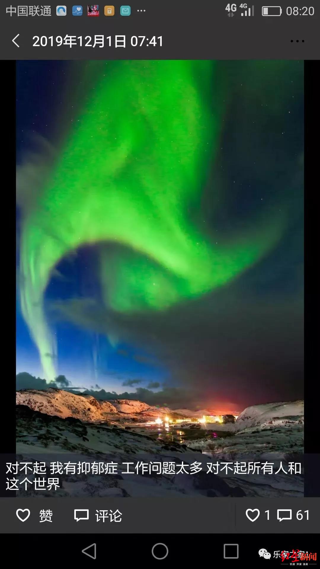 据谭女士在文章展示的朋友圈截图,邓某某在坠楼前曾于2019年12月1日7点41分发布了一条朋友圈消息,称“对不起,我有抑郁症,工作问题太多,对不起所有人和这个世界。”红星新闻记者了解到,11月20日,邓某某还在重庆和家人一起为孩子的周岁庆生。