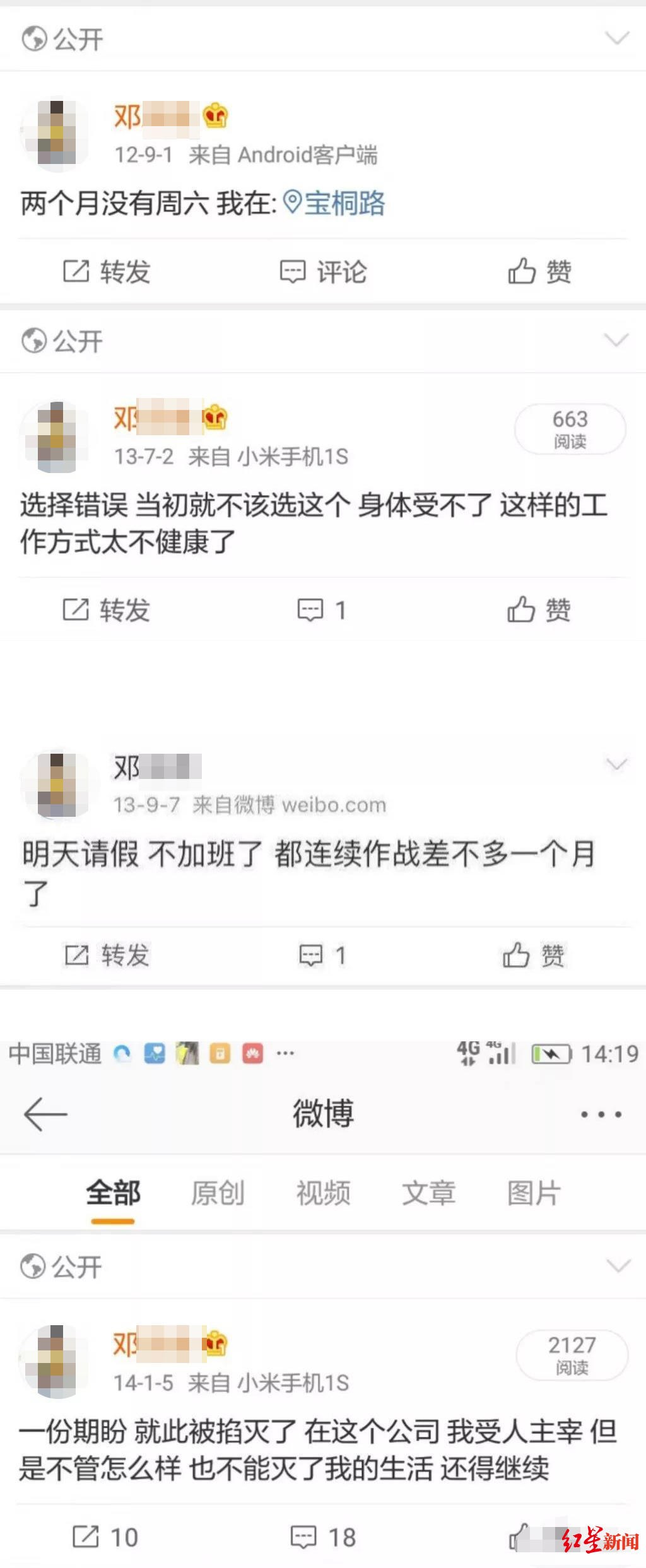 红星新闻注意到,邓某某曾多次在其个人微博上发表过有关工作的内容。在2013年7月2日的一条微博中,他曾写道“选择错误,当初就不该选这个,身体受不了,这样的工作方式太不健康了。”在2014年1月5日发布的另一条微博中则称“一份期盼就此被掐灭了,在这个公司,我受人主宰,但是不管怎么样,也不能灭了我的生活,还得继续。”