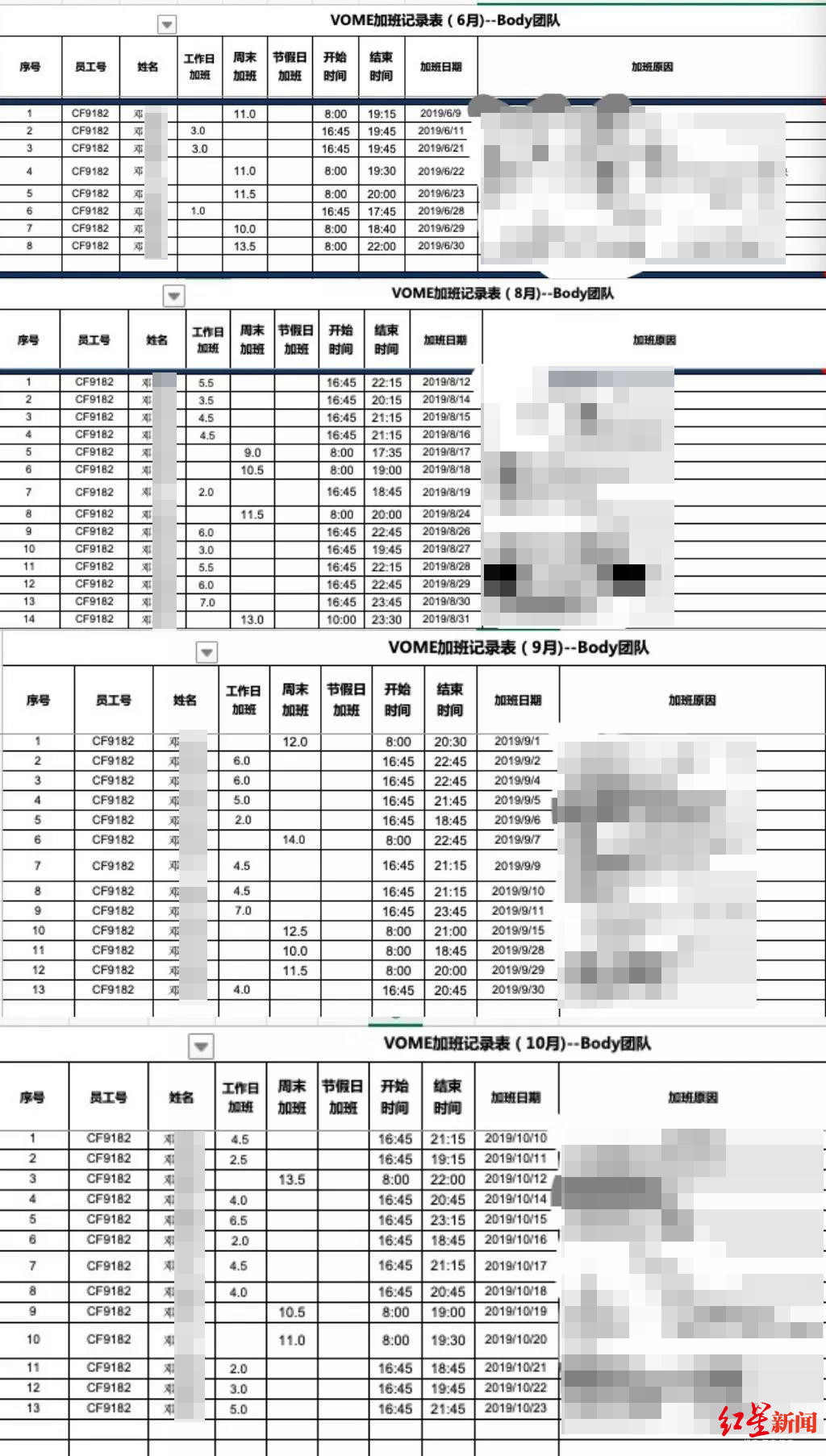 对此谭女士告诉红星新闻,“从2017年到现在他所有的打卡记录,我们已经全部记录下来了,放在文章里的只是其中的一部分。现在公司已经把打卡记录给删了。至于加班工资,家里面有了孩子各种经济开销大,我老公就想去赚点加班工资,结果突然说没就没了。然后让他们换休,但他们这种强度没办法换休,工作都做不完,而且换休时间过了后就会自动消除。2018年7月过去后,在杭州那边周末也不休,他应该是加班最多的,听我老公说加班费都有上万,本来我们还以为会有一笔挺好的收入,结果突然就没了,之前还等着12月份发加班工资。”