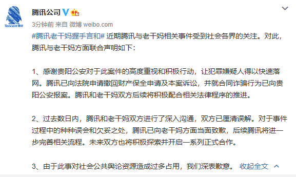 腾讯向老干妈当面致歉 双方握手言和 未来双方将积极探索正式合作 声明表示,腾讯已向法院申请撤回财产保全申请及本案诉讼,并就合同诈骗行为已向贵阳公安报案。腾讯和老干妈双方后续将积极配合相关法律程序的推进。 来源:搜狐财经 |