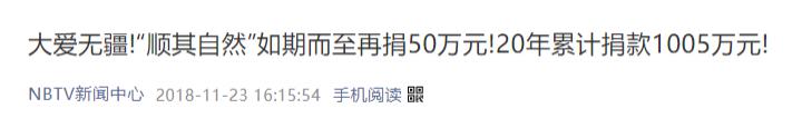 据宁波电视台报道,11 月 27 日上午,宁波市慈善总会的工作人员收到了一叠厚厚的汇款收据,上面汇款人姓名为 " 其然 ",这是 " 顺其自然 " 的又一次爱心捐款。这次慈善总会收到的汇款收据共 103 张,其中 9999 元有 101 张,50 元 1 张,51 元 1 张,合计 101 万元。