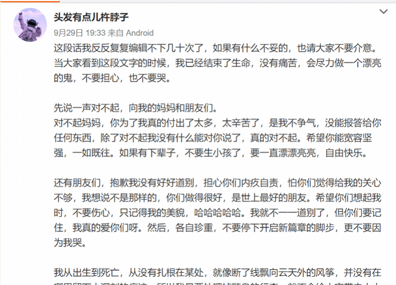 9月29日19:33,女孩阿杵在微博上留下了一篇近千字的“遗书”,自称因抑郁症而选择结束生命。 10月2日,上述博主再次发布消息,峨眉金顶的监控由于长期受恶劣天气的影响,几乎全部损坏,无法提供有价值的信息,线索中断。 来源:南方都市报 |