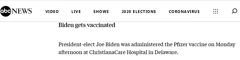 美国广播公司(ABC)刚刚消息,当地时间周一(21日)下午,美国当选总统拜登在位于特拉华州的克里斯蒂安娜医院(ChristianaCare Hospital)公开接种了辉瑞新冠疫苗。报道还说,拜登的夫人,吉尔·拜登博士周一早些时候已接种。