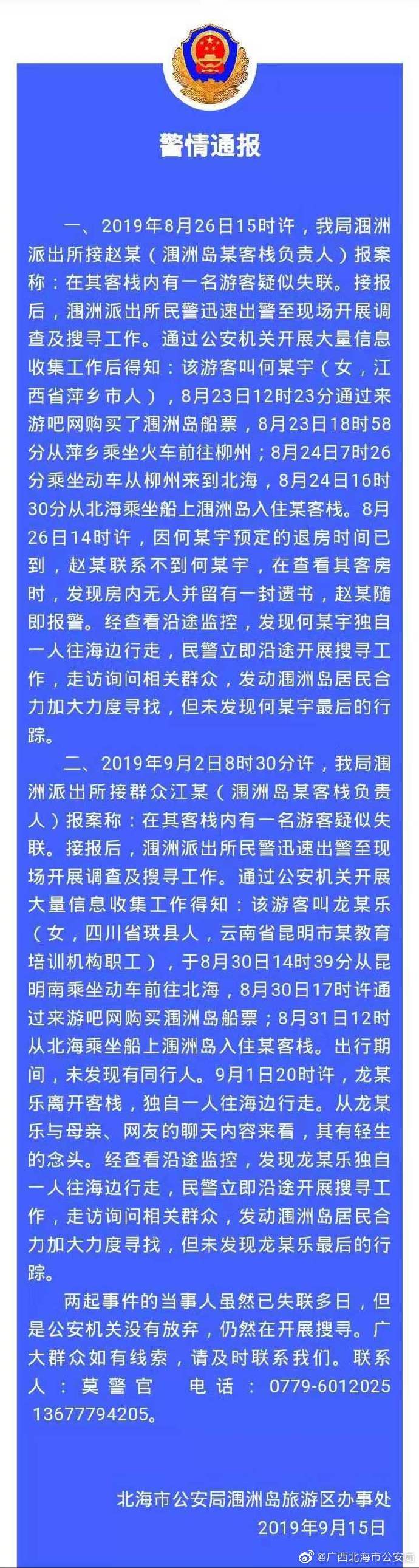 本网9月15日综合讯 (记者 李靖 赖流琴)今日下午,广西北海市公安局就2名女游客于8月26日和9月1日相继在涠洲岛失联发布通报,对失联情况予以说明。期间警方一直没放弃搜寻,呼吁群众提供线索。
