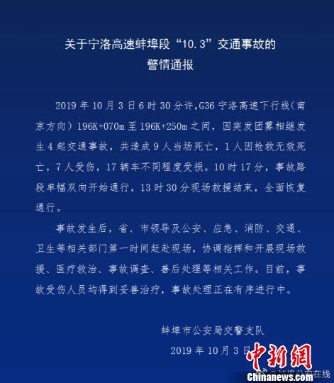 据安徽蚌埠公安在线发布的官微消息,2019年10月3日6时30分许,G36宁洛高速下行线(南京方向)196K+070m至196K+250m之间,因突发团雾相继发生4起交通事故,共造成9人当场死亡,1人因抢救无效死亡,7人受伤,17辆车不同程度受损。10时17分,事故路段单幅双向开始通行,13时30分现场救援结束,全面恢复通行。