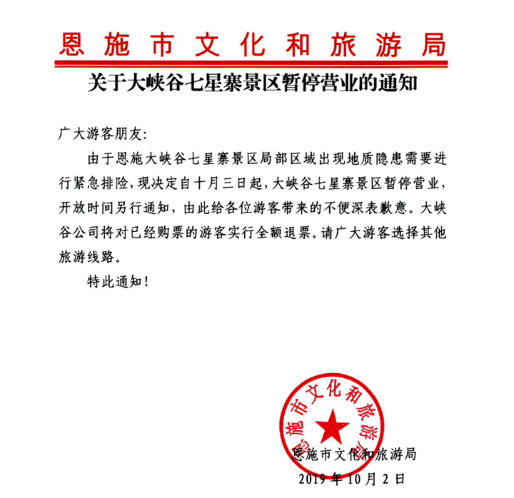 今日(10月3日)上午,中国硒都网发布消息称,10月2日18时许,恩施大峡谷风景区内“一炷香”平台处山体突发落石,致4名游客受伤。接到消息后,当地政府迅速组织有关单位第一时间赶往现场救治和处置,并迅速将受伤游客送往医院救治,其中3人经抢救无效死亡、1人轻伤正在医治。相关情况正在进一步核实中。 据公开资料显示,“一炷香”平台位于恩施大峡谷七星寨景区内。 13时许,新京报记者从恩施市政府一工作人员处获悉,上述消息为恩施市政府发布,事件属实,目前事件原因正在调查中,涉事景区已经暂停营业。 新京报记者注意到,在今日6时许,恩施大峡谷官方微博亦发布消息称,由于恩施大峡谷七星寨景区局部地区出现地质隐患需要进行紧急排险,现决定10月3日起,大峡谷七星寨景区暂停营业,开放时间另行通知,由此给各位游客带来的不便深表歉意,大峡谷公司将对已购票的游客实行全额退票。 一名成都的游客告诉新京报记者,他们一家人连夜开车于今日凌晨到达恩施大峡谷附近,被告知七星寨景区已经暂停营业,“只能换到周边景点去看看。”也有游客表示,因七星寨景区暂停营业,准备更换行程,转道去周边的鹤峰屏山峡谷或利川市玉龙洞景区游玩。 来源:新京报 |