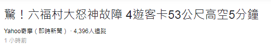综合台湾“中时电子报”等媒体10月11日报道,“大怒神”是六福村游乐园内最热门设施之一,但在台湾“双十”假期期间,其于11日下午疑因电脑安全侦测机制问题而突然停止运作,导致游客被卡在53米高、相当于17层楼的半空中动弹不得,持续时间约5分钟。