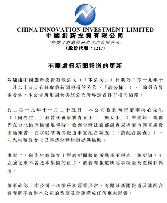 中国创新投资公司25日发表公告证实已收到向心夫妇的通知,称他们在台湾桃园机场离境时,收到台湾“调查局”的通知书,要求就参与情报及特务活动的新闻报道配合调查;向心及龚青(向心妻子)已聘请台湾律师协助。公告还说,向心和龚青对新闻报道事项一无所知,王立强从来不是公司员工,有关新闻报道所述事项全为虚构和伪造 ;目前公司一切照常,向心夫妇配合调查将不会对公司业务及运营造成任何重大影响。