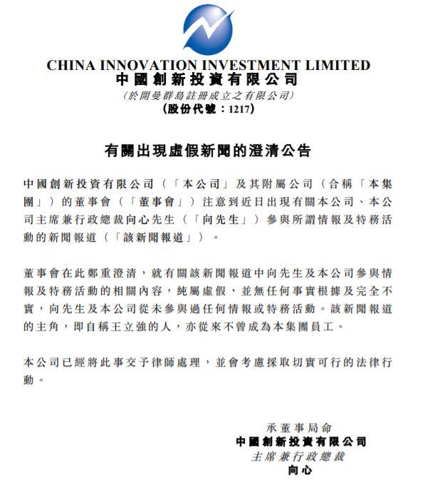 针对所谓的向心被王立强污蔑为“间谍头子”一事,“中国创新投资有限公司”曾发布公告表示,董事会注意到近日出现有关该公司、公司主席兼行政总裁向心参与所谓情报及特务活动的新闻报道。