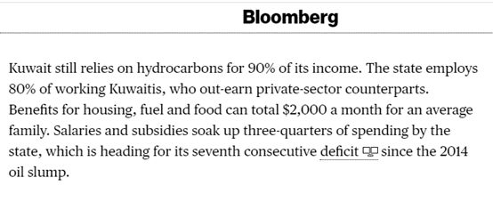 最后,彭博社称,除了科威特,其他中东靠着卖石油而富裕起来的国家,如今也都面临着要节衣缩食的局面。其中,沙特阿拉伯就已经开始削减福利并加税,巴林和阿曼这种石油资源不是太富裕的国家,则得向更富裕的邻国借钱。阿联酋则在想办法通过迪拜的崛起而多元化其经济,将迪拜打造成中东的金融和物流中心。